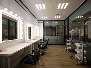 全屋的隔音吸音牆面设计,使拍摄环境安静,声音清晰。冷热空调和恒温新风系统,在任何季节都会使人感觉舒适。独立的化妆间,具备三色可变色温灯光可以满足不同造型师和化妆师的要求,更衣室更备有蒸汽立体服装挂烫机。不仅有独立私密的卫生间,还有冷热水的淋浴房。自助指纹储物柜,安全方便。饮水机、咖啡机、微波炉等一应俱全,还有免费wifi提供。接待区吧台,特殊材料的整块台面显示出豪华时尚。